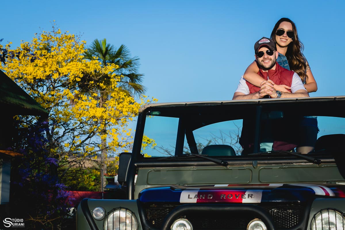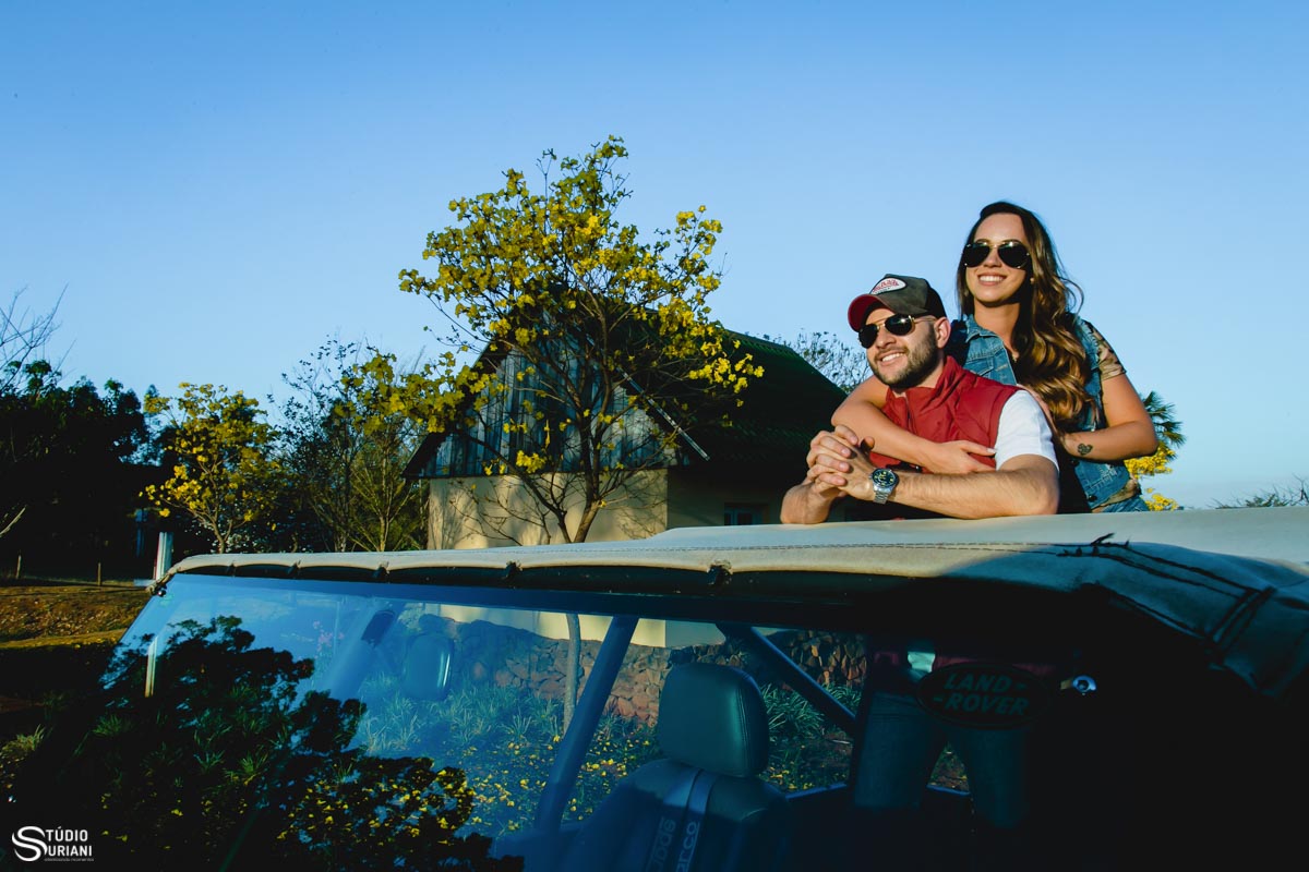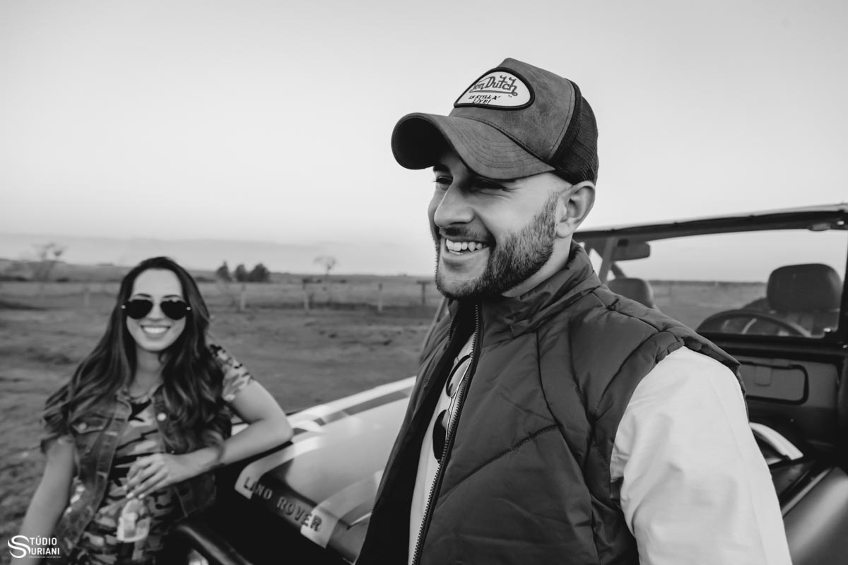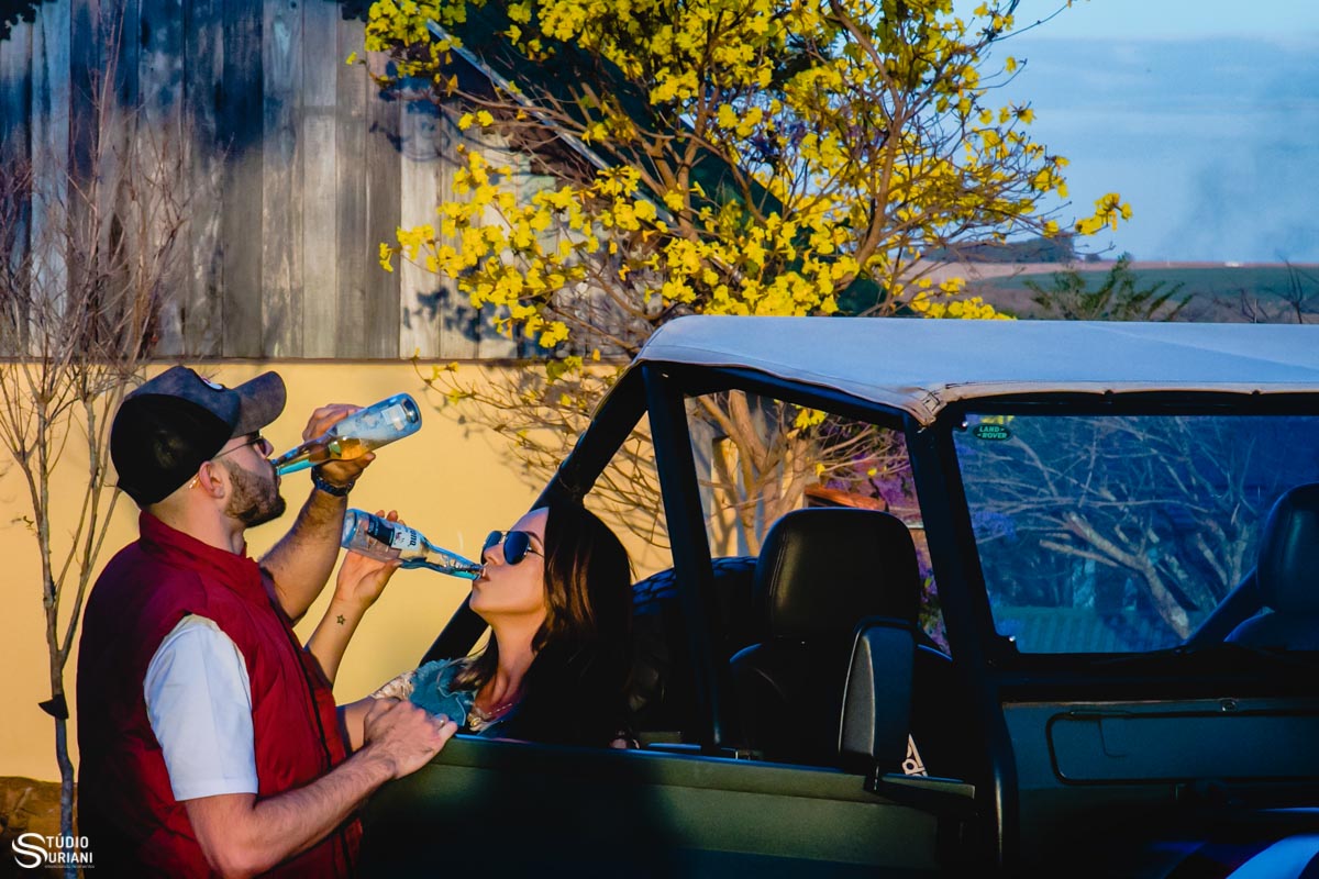 Nesta parte do ensaio, nós usamos o Jeep que é uma paixão do noivo e a cerveja que é algo que eles gostam bastante.