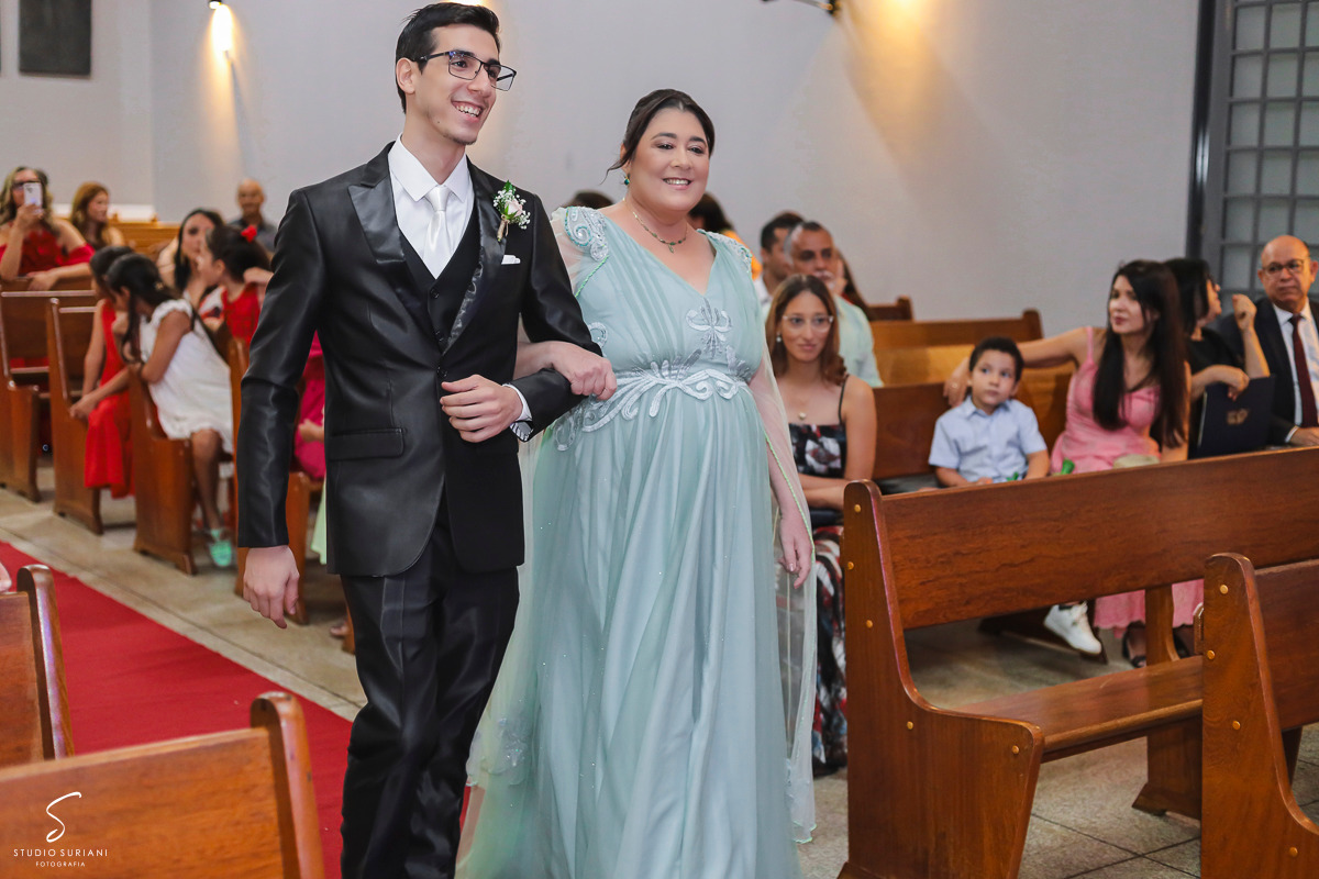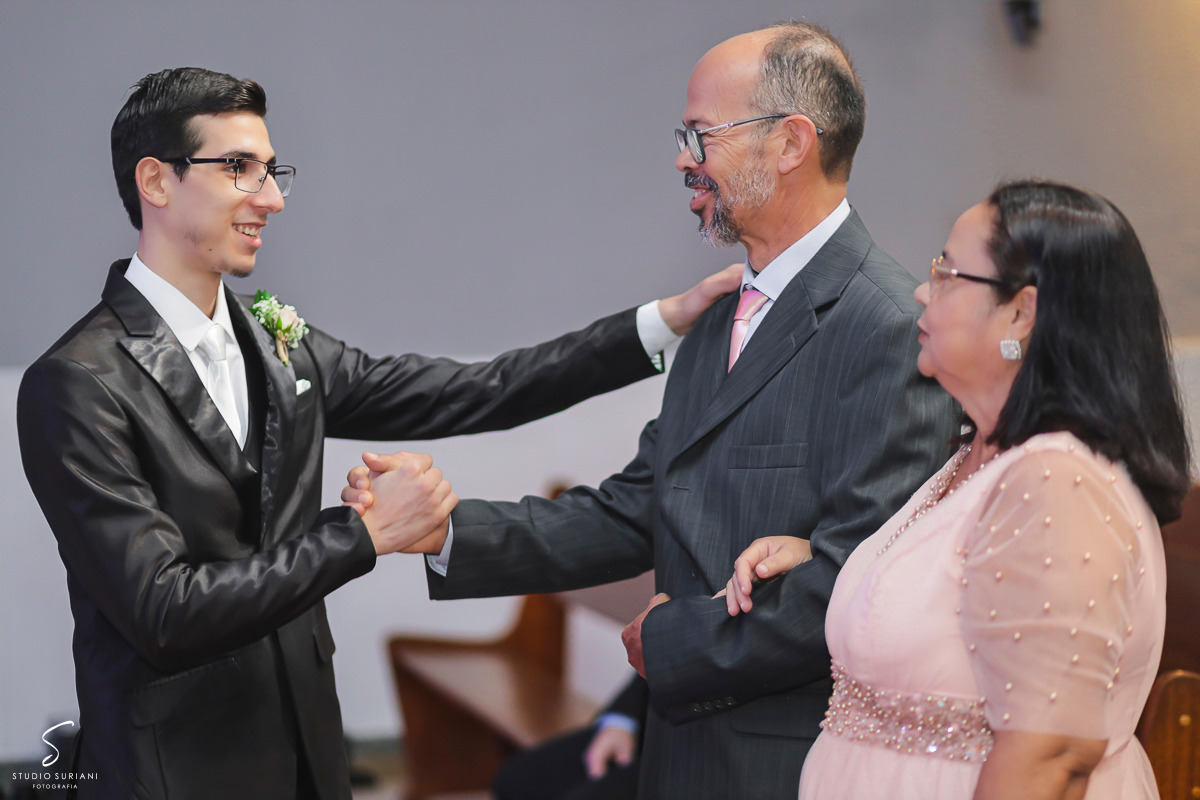 A cerimônia aconteceu na Igreja de Deus no Brasil, no bairro Saraiva, e foi cercada por uma atmosfera de cooperação e carinho. Familiares, amigos e membros da igreja se uniram para tornar tudo perfeito. O noivo, radiante, fazia questão de cumprimentar cada padrinho na entrada da igreja. Mas o momento mais marcante veio com a entrada da Ana: ele simplesmente não conseguia desviar o olhar dela. O encantamento era evidente — uma daquelas cenas que a gente sente privilégio em registrar.