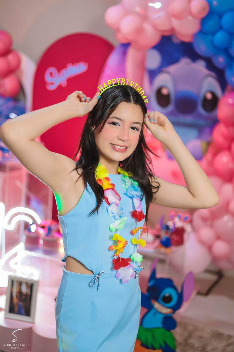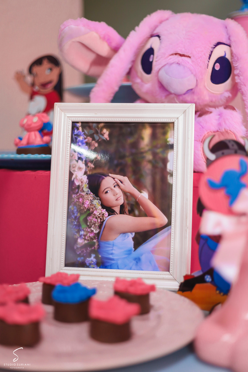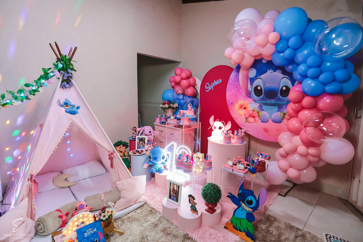 E como se não bastasse toda essa atmosfera encantadora, a festa contou com um convidado especial: um personagem vivo vestido de Stitch, que dançou, brincou e arrancou sorrisos das meninas durante toda a noite. Foi um momento de pura euforia, que com certeza ficou marcado na memória das pequenas.