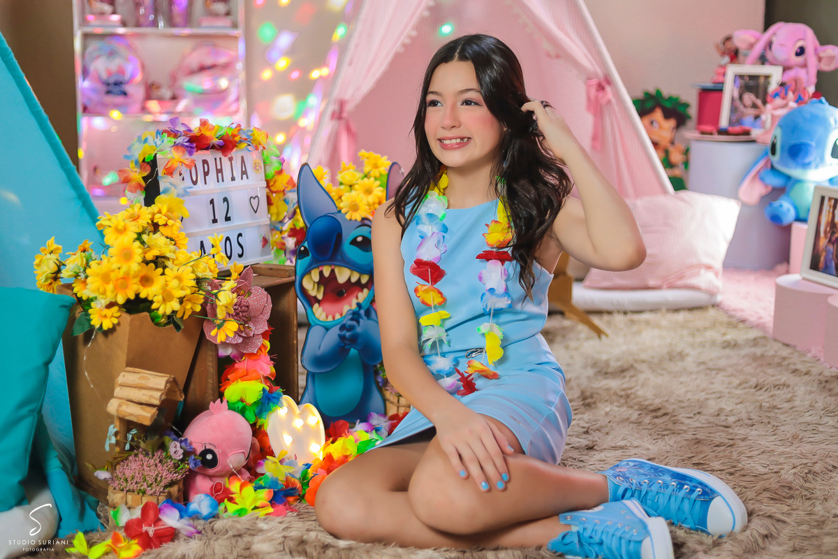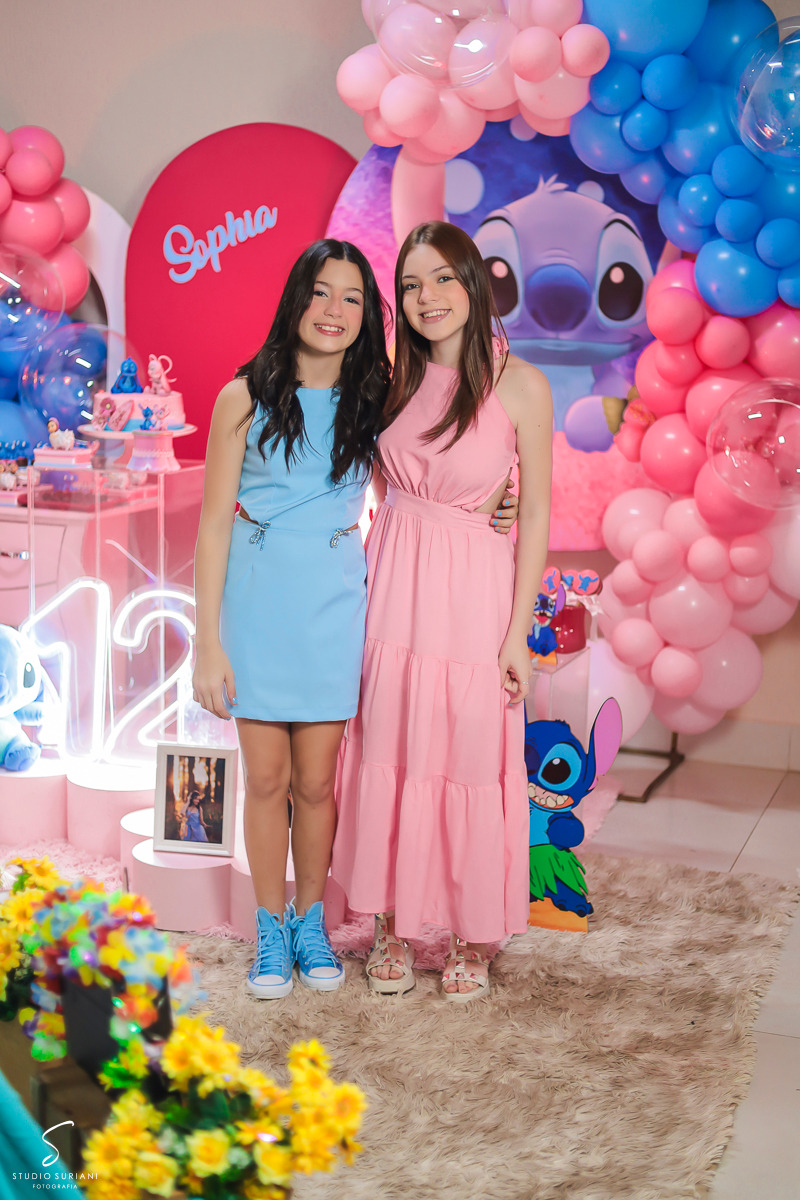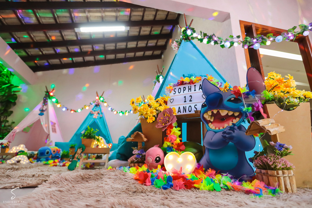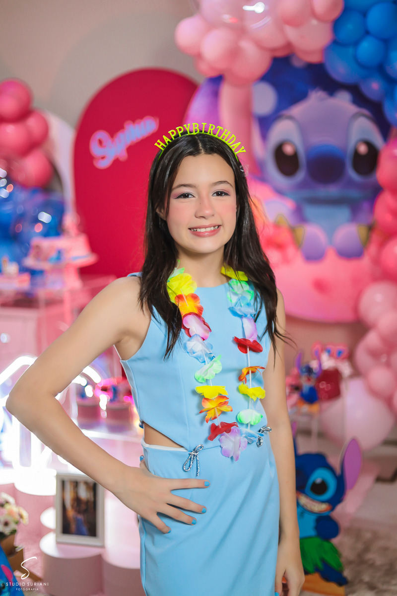 E como se não bastasse toda essa atmosfera encantadora, a festa contou com um convidado especial: um personagem vivo vestido de Stitch, que dançou, brincou e arrancou sorrisos das meninas durante toda a noite. Foi um momento de pura euforia, que com certeza ficou marcado na memória das pequenas.